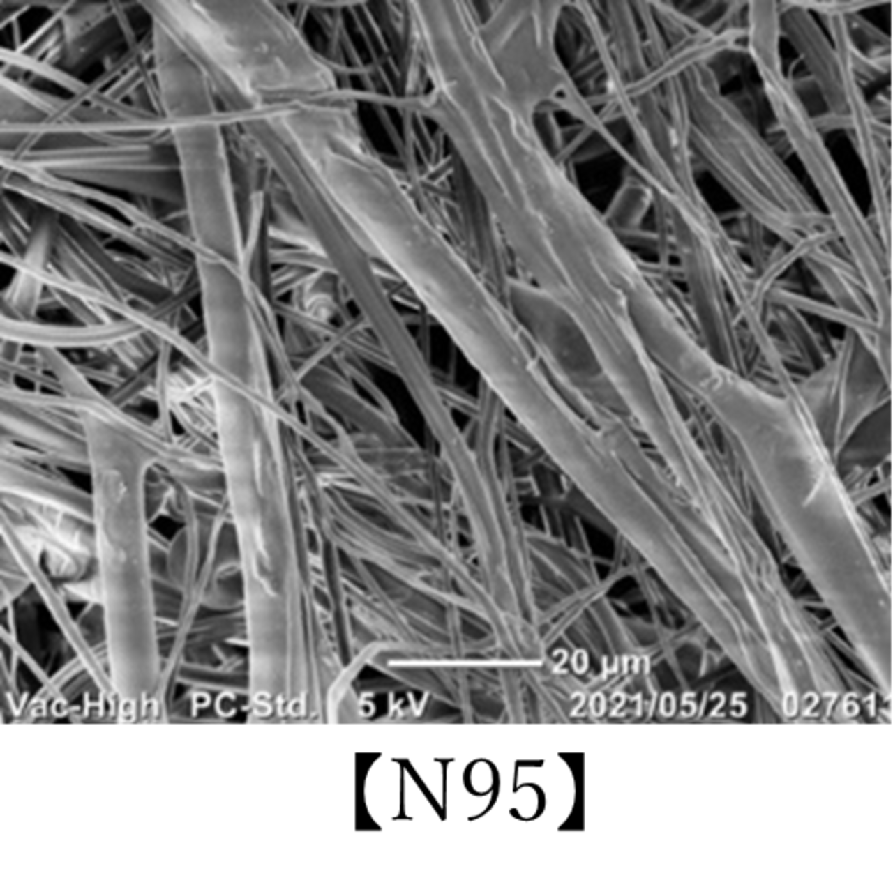 東京工業大学谷岡名誉教授が開発した高機能ナノファイバーフィルター使用。その繊維は不織布マスクの繊維の10分の1の超微細繊維。その超微細繊維が生み出す「ファンデルワールス力(分子間力)」により細菌やウイルスと同等の大きさ0.1㎛の微粒子を99%以上吸着捕集します。