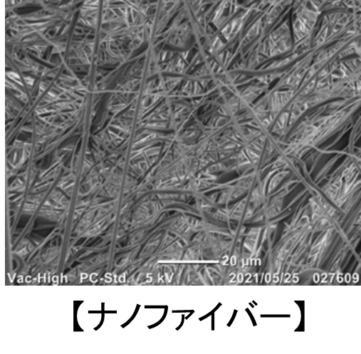 「ナノファイバー」は新エネルギー産業技術総合開発機構(NEDO)のナノファイバー技術開発プロジェクトを発端とし、国の開発費で開発・製造されました。当初の想定用途は「1.空気、水及び油などの各種フィルタレーション」「2.リチウムイオン電池やスーパーキャパシタなどのセパレータ用途」「3.細胞の培養培地などバイオ用途」で、マスク用途ではありませんでした。「ナノファイバー」の繊維径は0.08~0.4マイクロメートルと極めて細かく、一般的な不織布マスクの3~5マイクロメートルと比べて10分の1以下です。超微細な繊維は分子レベルで引き合う「分子間力」が強く働き、0.1マイクロメートル以下の微細な粒子をキャッチすることができるため、マスクのフィルターとして活用されることになりました。
